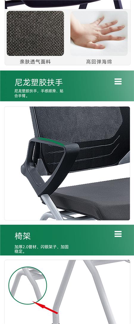 1、学生培训椅椅架:采用25圆管1.5厚铁钢管。 2、学生培训椅胶壳:PP加纤材质,背连接部件为铝合金,可倾仰回弹,坐感舒适。 3、学生培训椅座垫:定型海棉座垫 。 4、学生培训椅功能:座垫可上翻连排堆叠摆放。