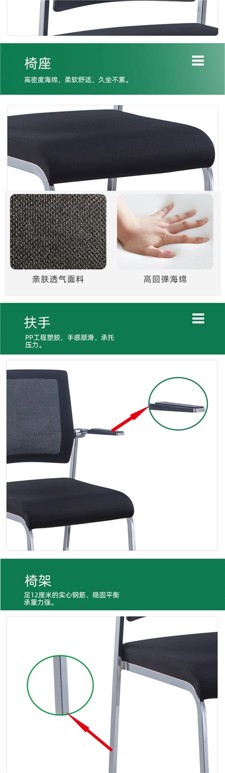 1、培训椅1.8厚电镀架子 2、靠背双层网,高密度高回弹力原生纯棉,弹力布面料,回弹好,坐感舒适,不塌陷,耐磨抗皱 3、扶手可上下90°收折
