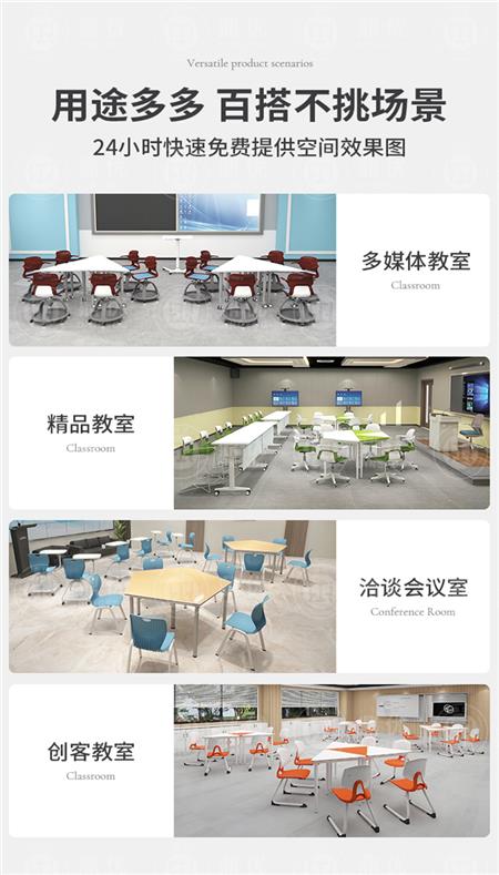1、热销组合三角形培训桌 2、可折叠,可拼接组合结实耐用 3、时尚搭配您的录播教室和会议室